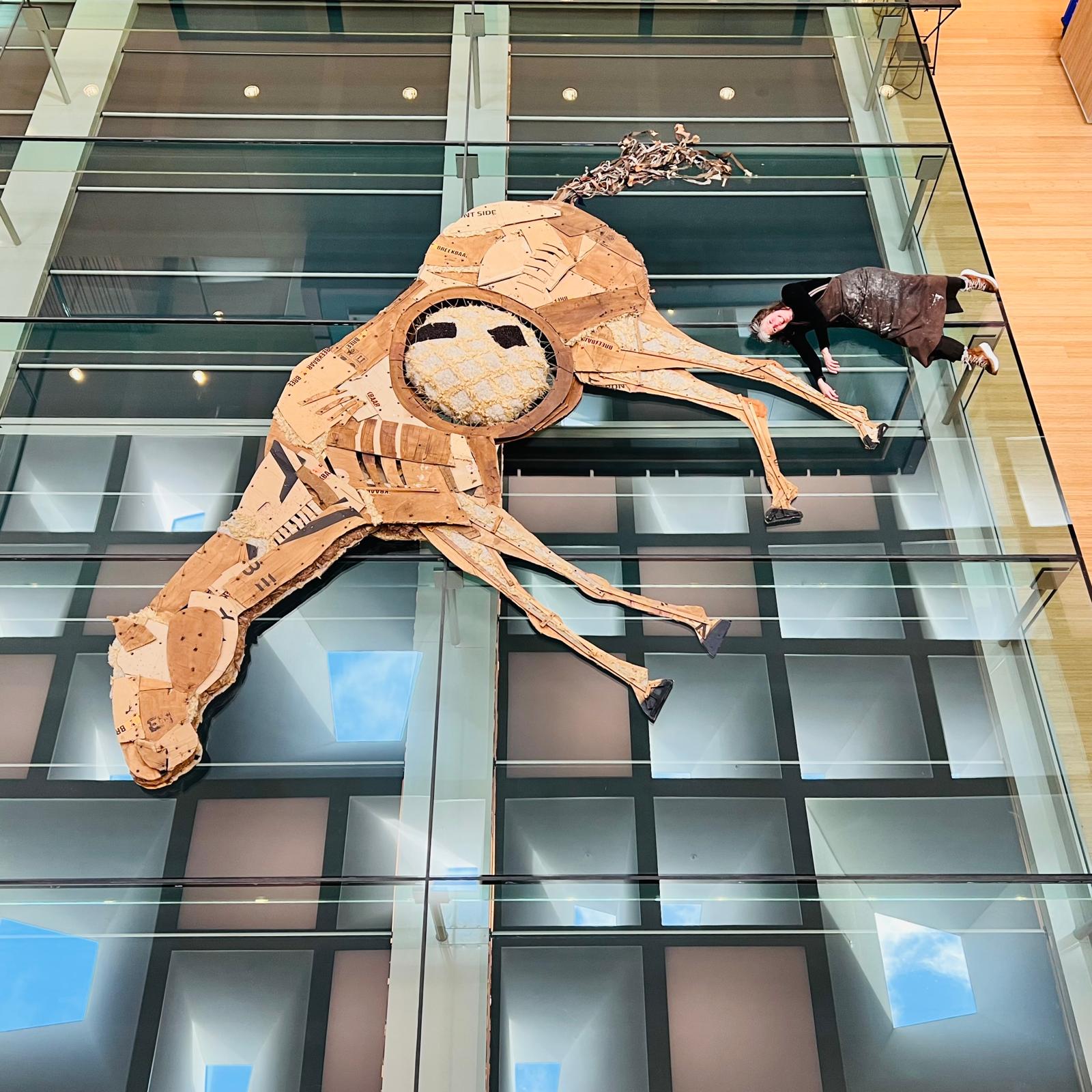 Ik ben nog steeds op zoek naar een stal, een permanente plek voor dit beeld, maar voorlopig slaapt deze Sleeping Beauty vredig op het glazen plafond van het Provinciehuis tot eind juni 2026. Ze is ook van onderaf te zien, waarbij het net lijkt alsof er een enorm paard uit de lucht is gevallen.