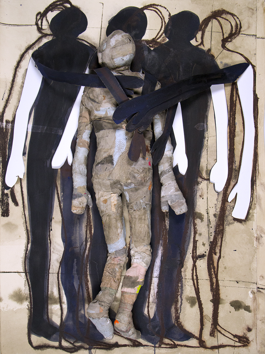 Don't Forget, 2022, 68 x 53 x 9 cm, gouache en conte op papier, beeld van oude lakens met stijfsel, beschikbaar