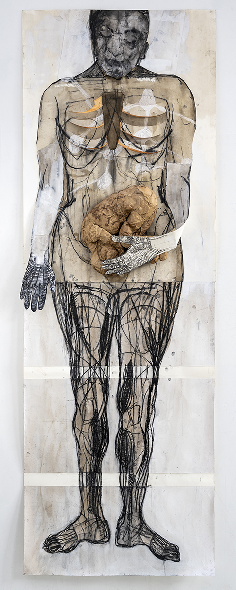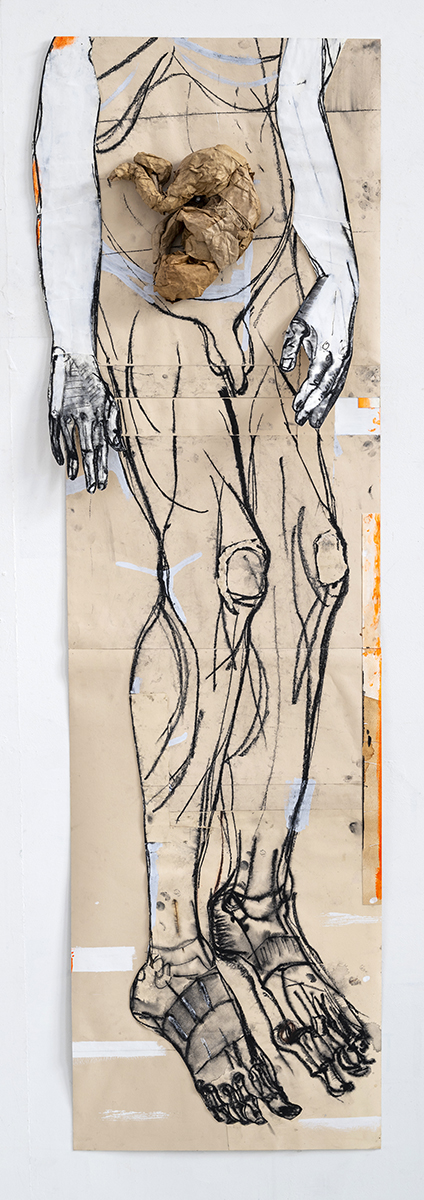 Hard Labour, opdracht sacristie Akerk, 2026, houtskool, aquarel, sculptuur van papier maché, 293,50 x 99,5 x 22 cm
